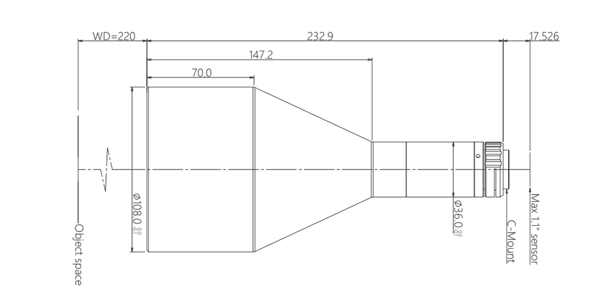 Working Distance(mm) | 220±2 | Max Sensor Size(φmm) | 18.0(1.1") | ||||